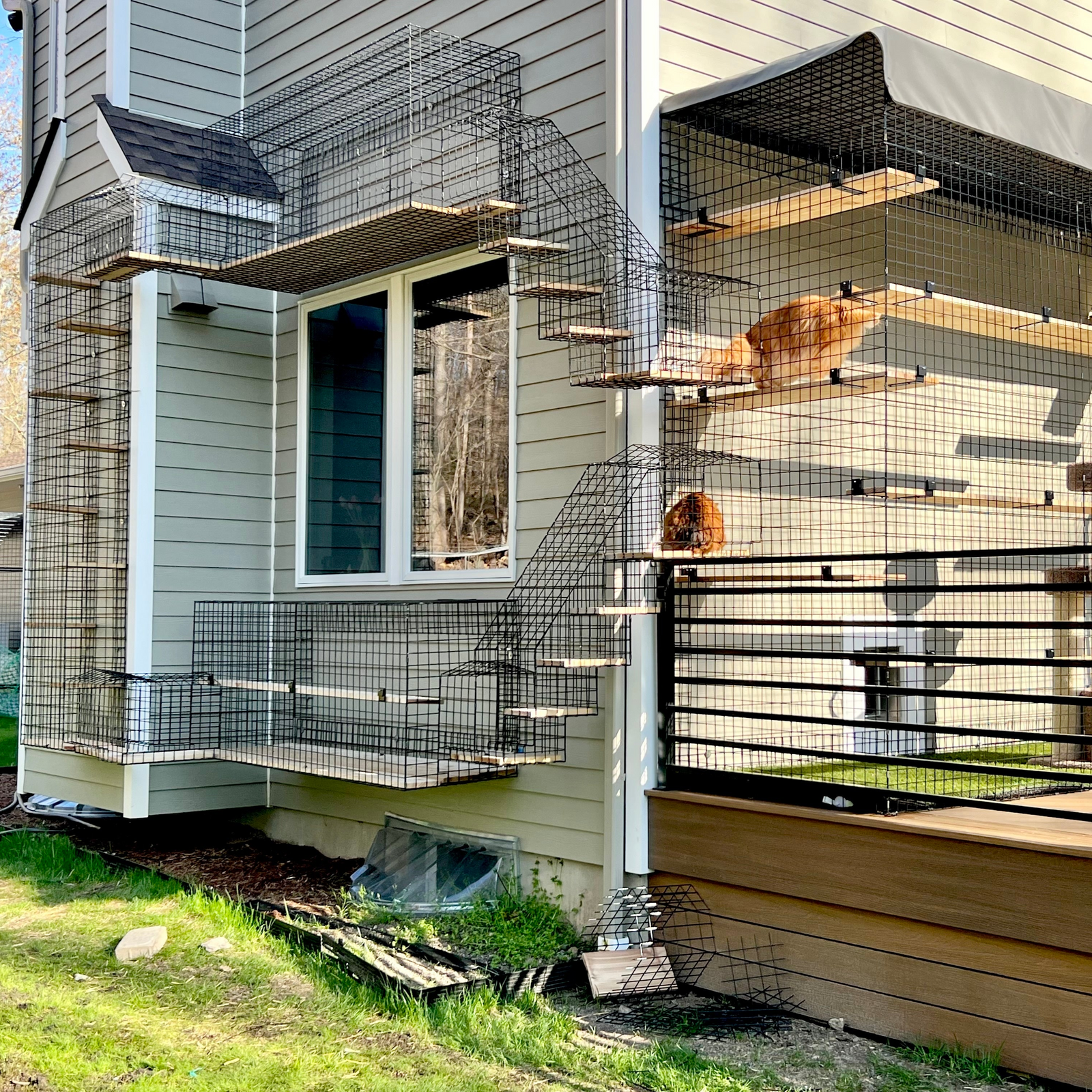 Use hundreds of different modular catio components to build your custom catio! From enclosures and tunnels to stairs, bridges, and endless accessories you can create your own outdoor cat oasis with our modular catio components!